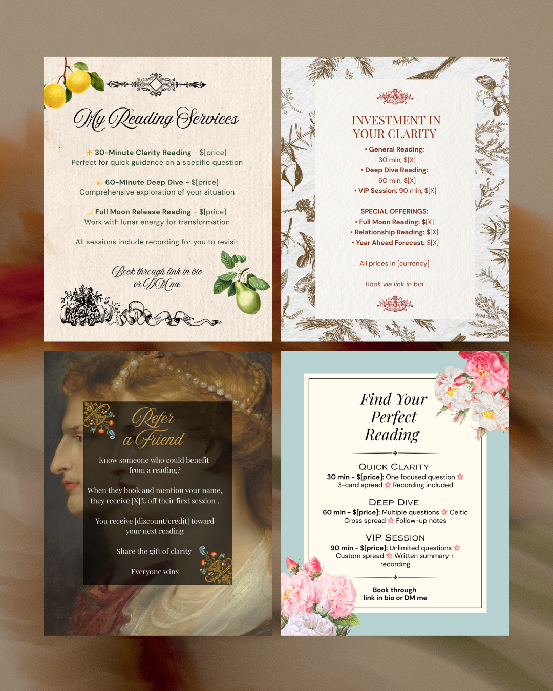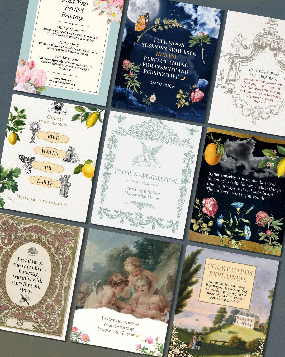 Every template comes with thoughtful copy already inside — card of the day captions, reading promotions, educational content and booking information. Written and waiting. Use as-is or make it your own.